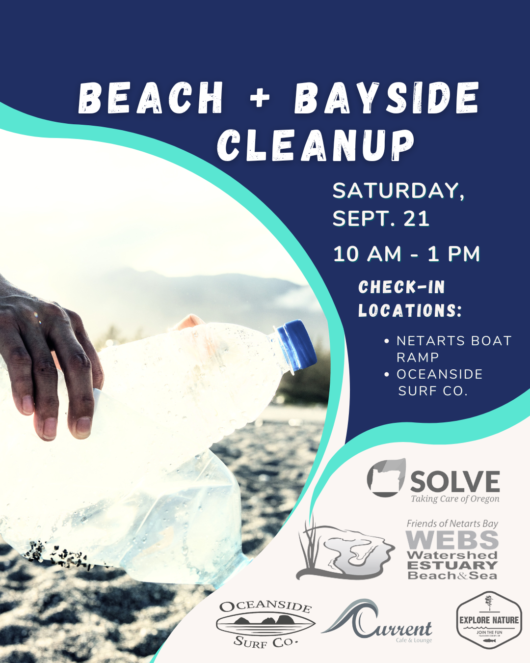 Join SOLVE, Friends of Netarts Bay WEBS (www.netartsbaywebs.org), Oceanside Surf Co./Current Cafe, Netarts Oceanside Fire, and other Tillamook County partners to clean up the areas around Netarts and Oceanside on September 21 from 10 AM - 1 PM. Friends of Netarts Bay WEBS members and our partners have been working with SOLVE to host cleanups in the area from Cape Lookout to Cape Meares to Bay Ocean for over a decade. Join us this year and help us protect marine life and maintain the beauty of our coast. This beach cleanup is family-friendly, and dog-friendly. Volunteers of all ages will find the event fun and rewarding.