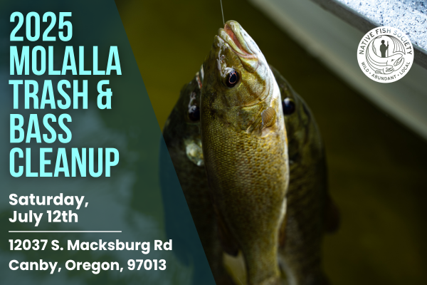 Join Native Fish Society and Molalla River Watch for a fun, family-friendly event on the beautiful Molalla River for anglers and community alike! This is a truly top-to-bottom chance to care for a special river, where in one day, after a sure-to-be busy holiday weekend, we’ll spend a few hours removing trash from along its banks while anglers remove harmful Smallmouth bass from the waters of the Molalla. In the evening we’ll have a group fish fry, barbecue and a raffle!