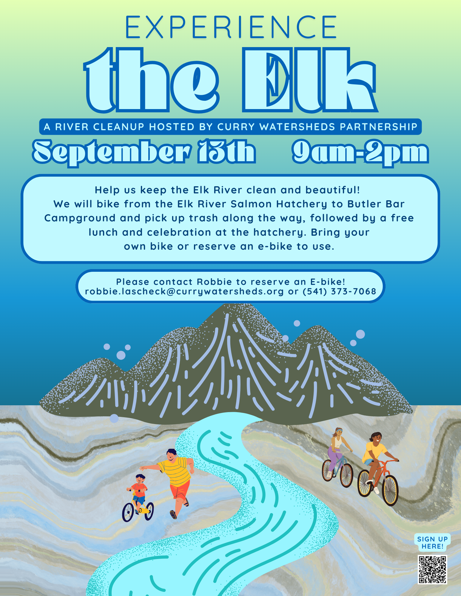 We will bike from the Elk River Salmon Hatchery to Butler Bar Campground and pick up trash along the way, followed by a free lunch and celebration at the hatchery. Bring your own bike or reserve an e-bike to use.
